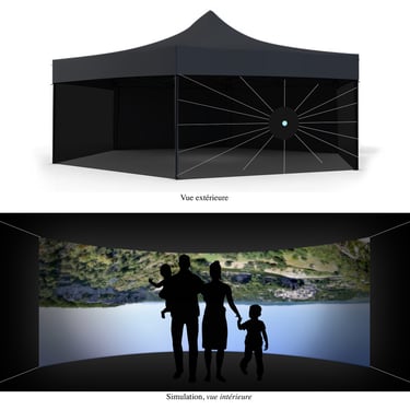 Camera Obscura est un dispositif de projection capable de créer une image de l’environnement extérieur par le biais de la projection. Connue depuis l’Antiquité, elle révèle un phénomène habituellement dissimulé notre regard à travers nos appareils photographiques. En plongeant ce kiosque dans une obscurité totale et en laissant passer la lumière à travers une lentille convergente, les rayons lumineux venant de l’extérieur produisent une image lumineuse inversée à l’intérieur. Ainsi, en entrant dans ce dispositif, le spectateur pénètre sans en avoir conscience à l’intérieur d’un œil à échelle humaine.