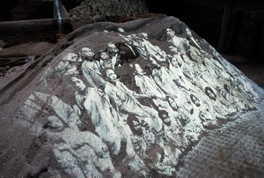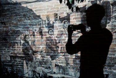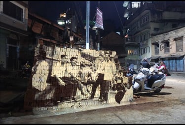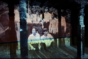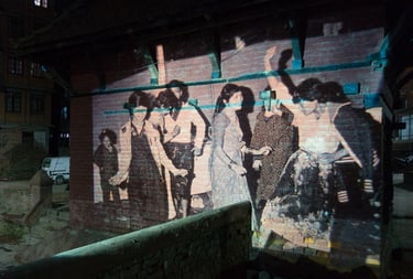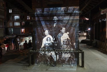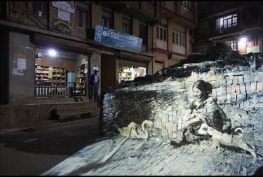 Projetés sur les murs ou les amas de gravats disposés ici et là après le tremblement de terre de 2015, les projections de la Nepal Picture Library rendent à nouveau présents dans la pierre, la terre ou le sable, les sujets effacés par le temps. Par leurs apparitions lumineuses sur ces matériaux, elles nous rappellent en même temps l’inévitable retour des choses à la terre.