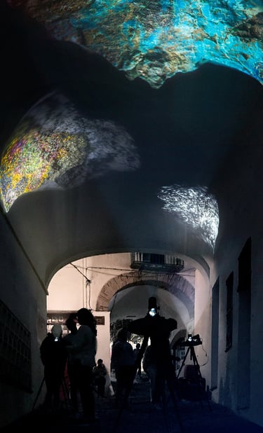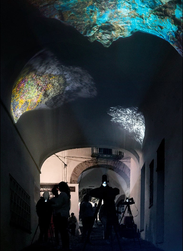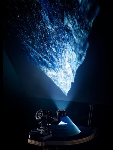 Nous naviguons entre deux mondes, il y a la matière que nous saisissons de nos mains, et la lumière qui se recueille dans le creux de notre rétine. L’installation Pierres de Lumière révèle cette double nature du monde. Dans un ingénieux dispositif optique, la matière se transmutent en image grâce à de leur lumière projetée. L’exposition présente donc des pierres qui produisent des images projetées grâce à la lumière qu’elles renvoient. Saisies par nos yeux, ces grandes projections lumineuses nous transportent dans un nouvel univers. Ces vues macroscopiques dessinent des astres, des galaxies, des paysages cosmiques, où chacun, par la poésie de son propre regard, projette ses propres visions.