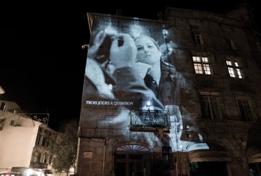 Projetées le plus souvent à taille réelle, les images de films viennent s’inscrire comme de véritables petites scènes de vie déposées sur les surfaces. C’est au total quinze projections fixes qui fabriquent ce théâtre d’image sur la Place du Château, auxquelles s’ajoute quatre autres, plus grandes à proximité du centre Le Bournot et une devant le cinéma Le Navire.